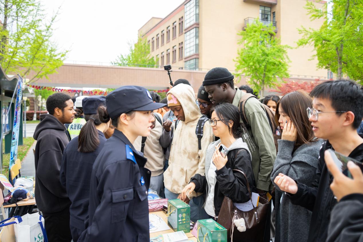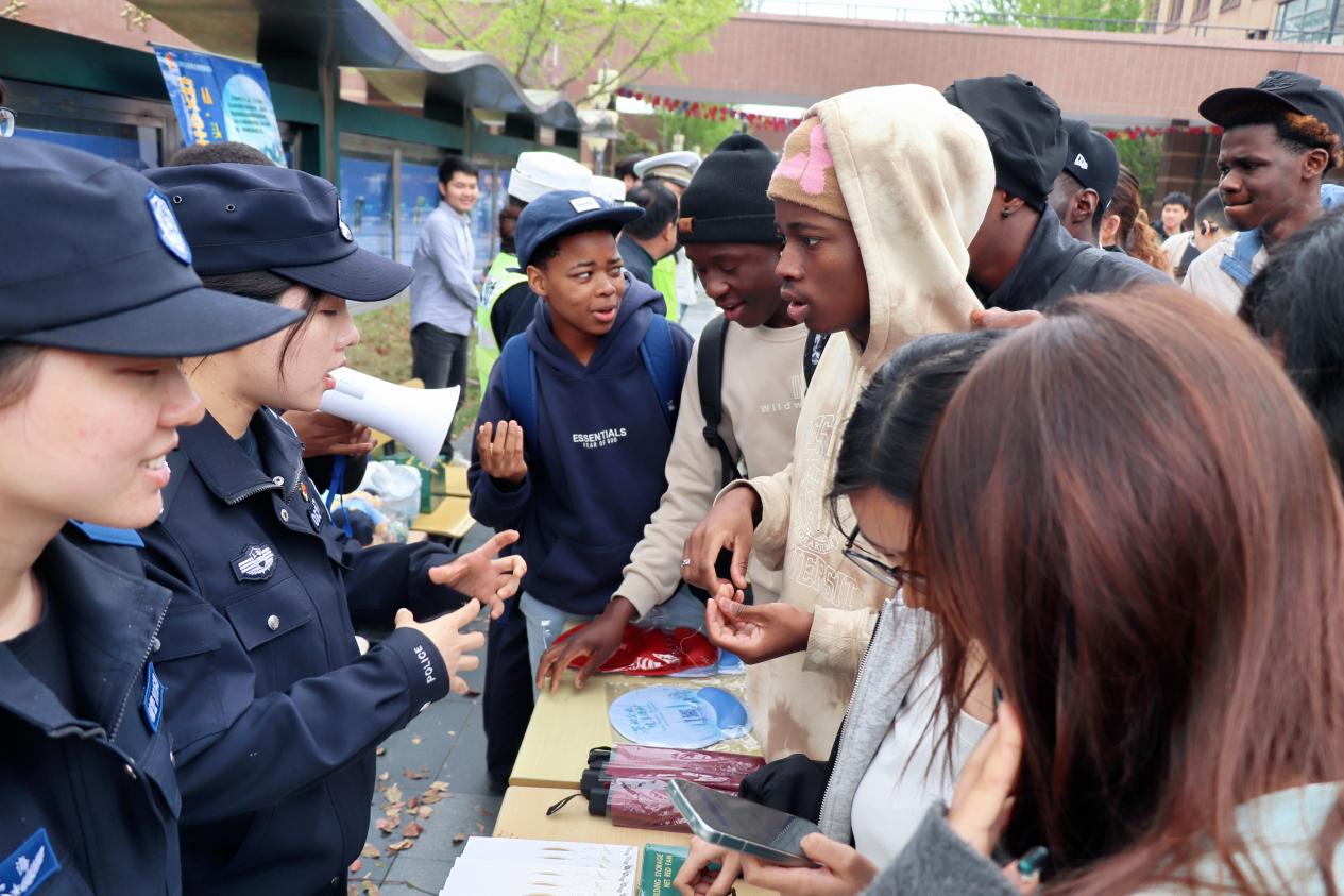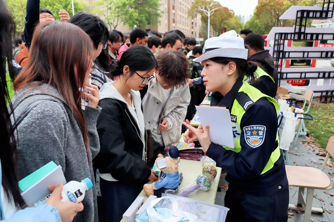 协同联动:多方宣讲汇聚合力。活动期间,半月广场化身为国家安全教育的“实景课堂”。学校党政办、宣传部、保卫处、保密办携手浦东出入境管理支队、临港高校派出所、交通管理等部门联合进驻,面向不同师生群体开展靶向式宣传教育。保密办通过案例展板和现场讲解,普及保密法律法规和日常保密常识,提醒师生“保密无小事,言行需谨慎”;出入境工作人员专门面向留学生群体,解读涉外法律法规和签证政策,帮助留学生增强安全防范意识;临港高校派出所民警结合近期高发的刷单返利、冒充熟人等真实案例,剖析诈骗手法,传授“不轻信、不透露、不转账”的防骗要诀;交警通过展板展示、头盔佩戴演示、事故案例警示等方式,重点讲解电动自行车骑行规范与交通安全知识,引导师生养成文明出行习惯。多部门协同发力,让国家安全教育在互动体验与联合宣讲中落地生根。
